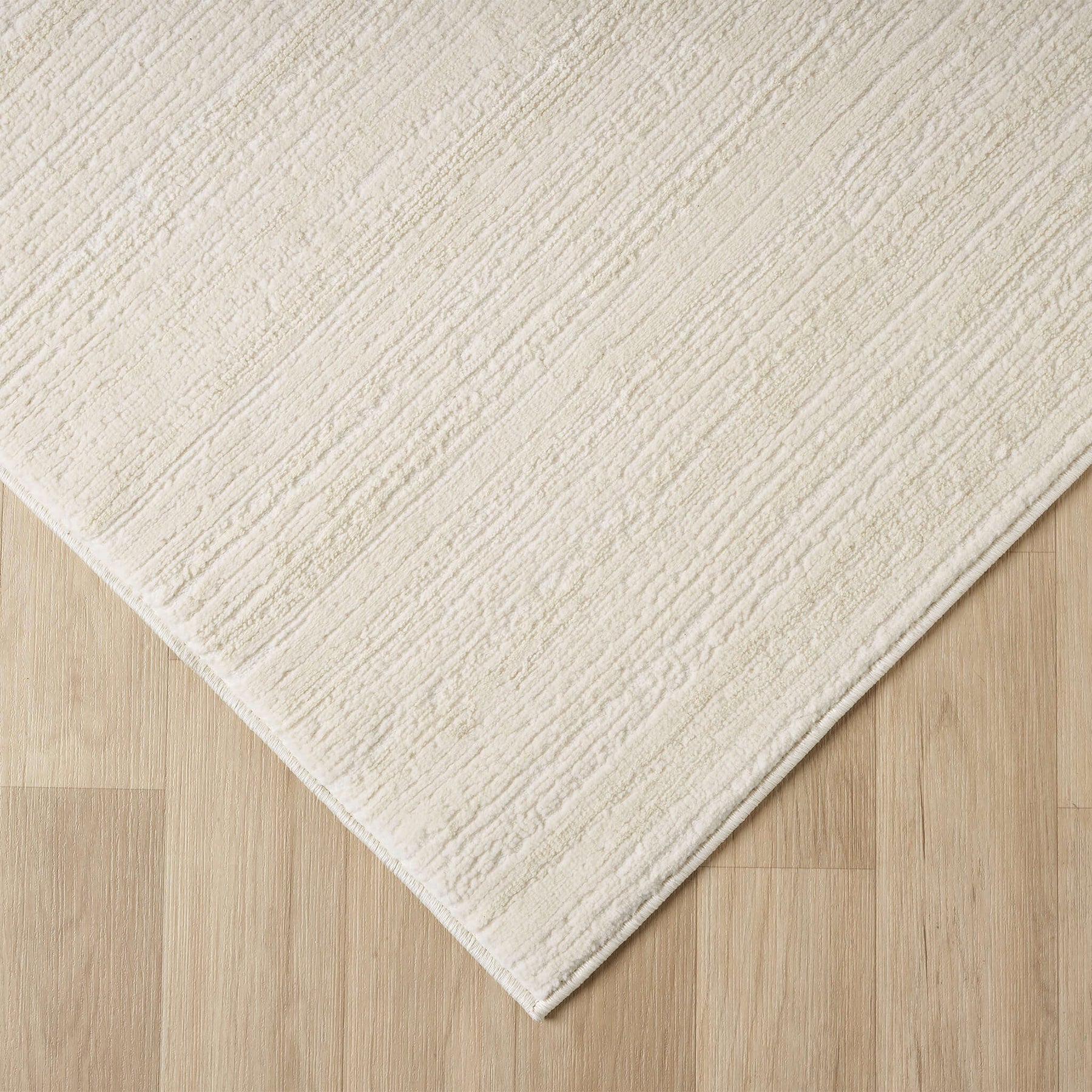 A soft cream rug with a beautifully distressed border that adds gentle depth and character to bright, modern interiors.