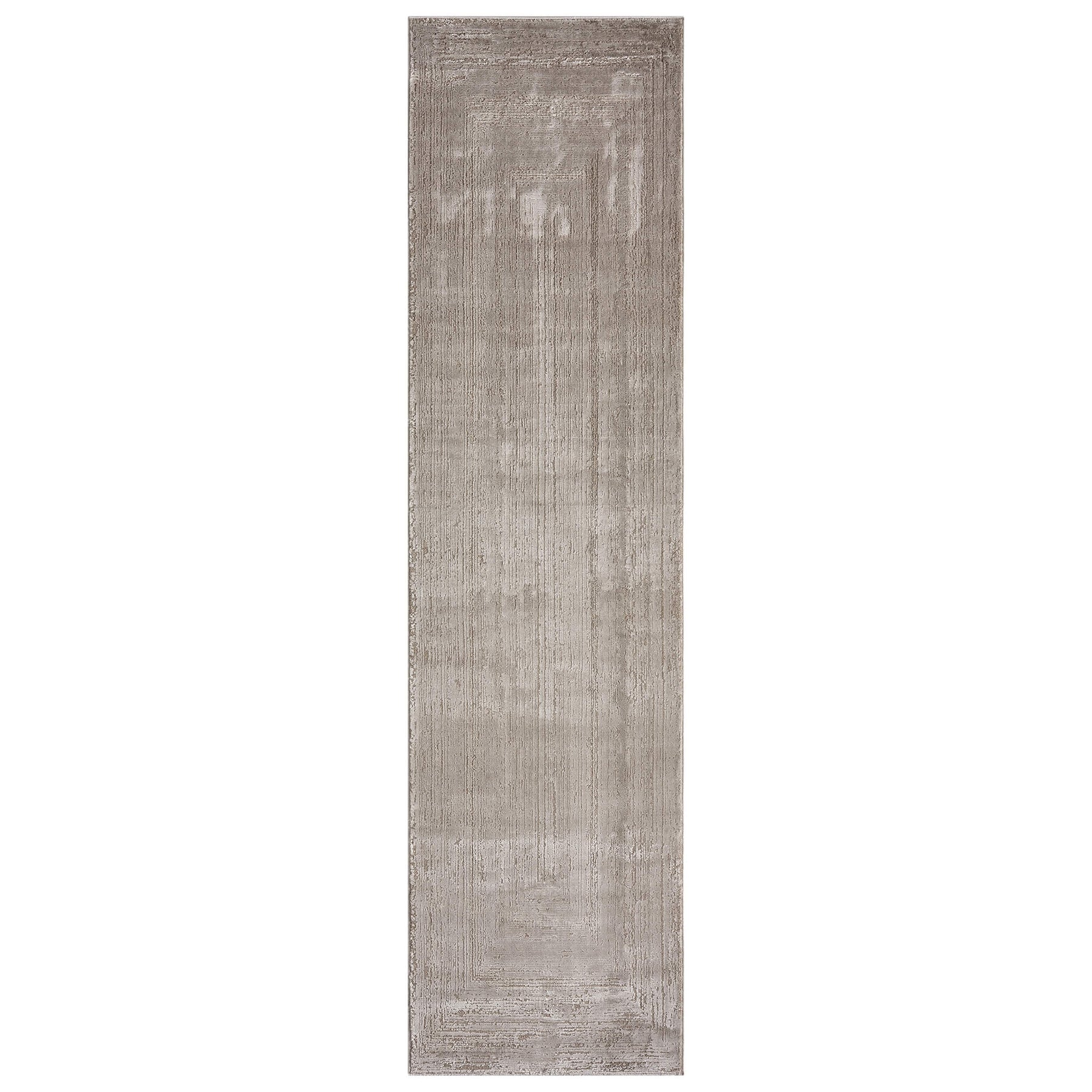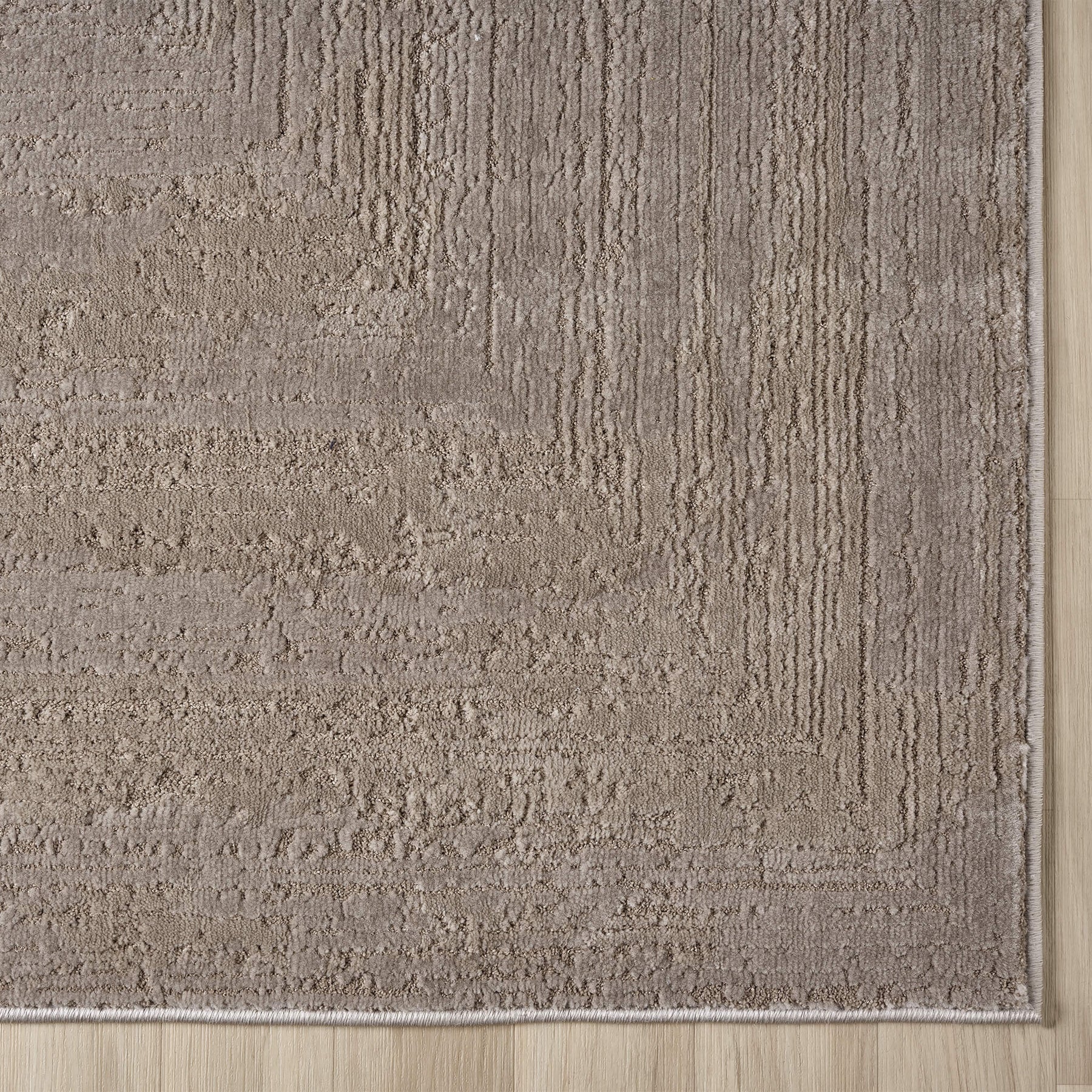 This beige rug showcases a subtle distressed border that blends seamlessly into neutral dŽcor while adding refined texture.