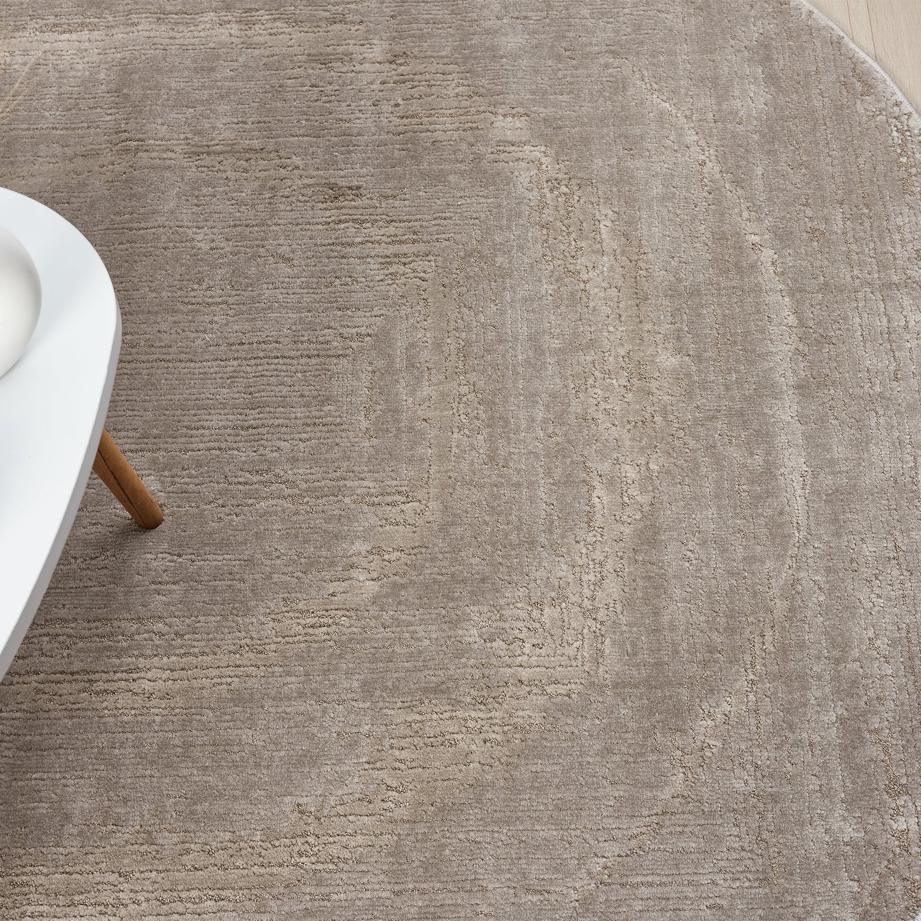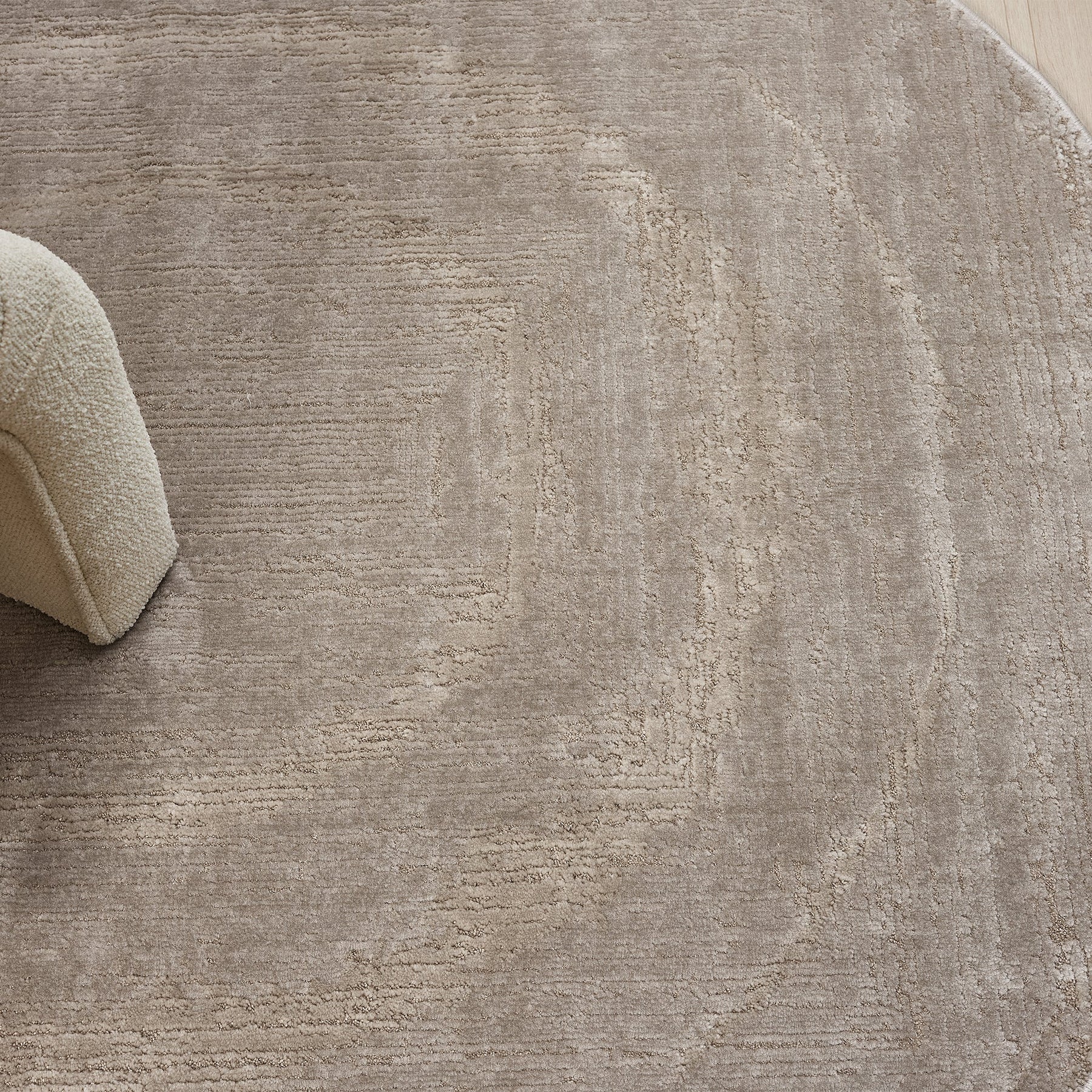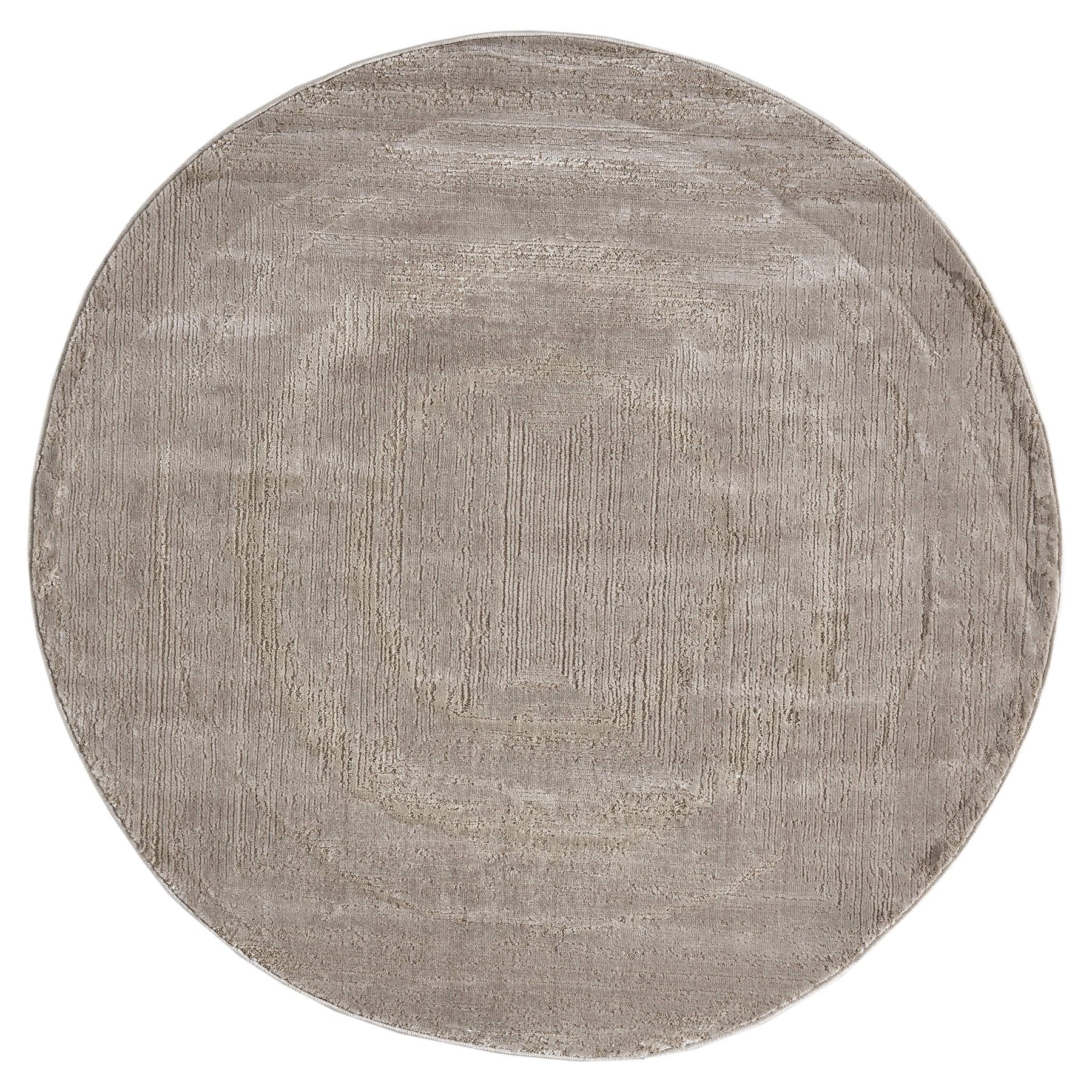 This beige rug showcases a subtle distressed border that blends seamlessly into neutral dŽcor while adding refined texture.