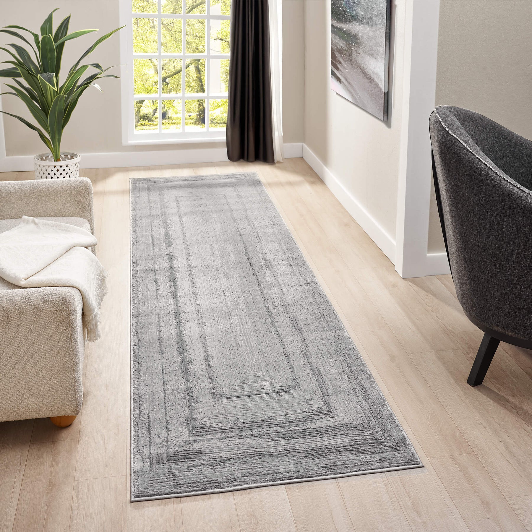 A versatile grey rug enhanced with a tonal distressed border, bringing understated sophistication to minimalist spaces.