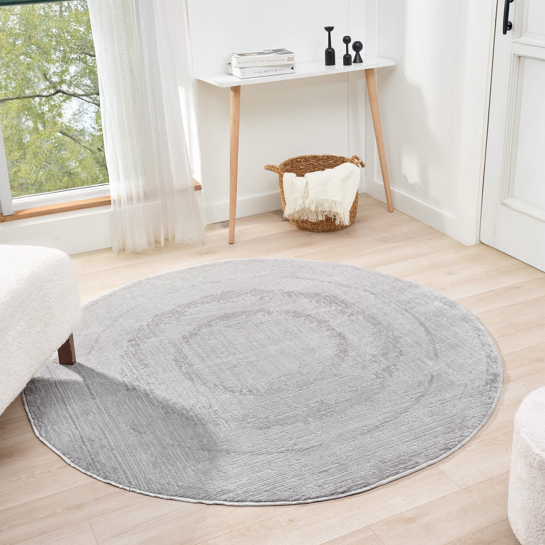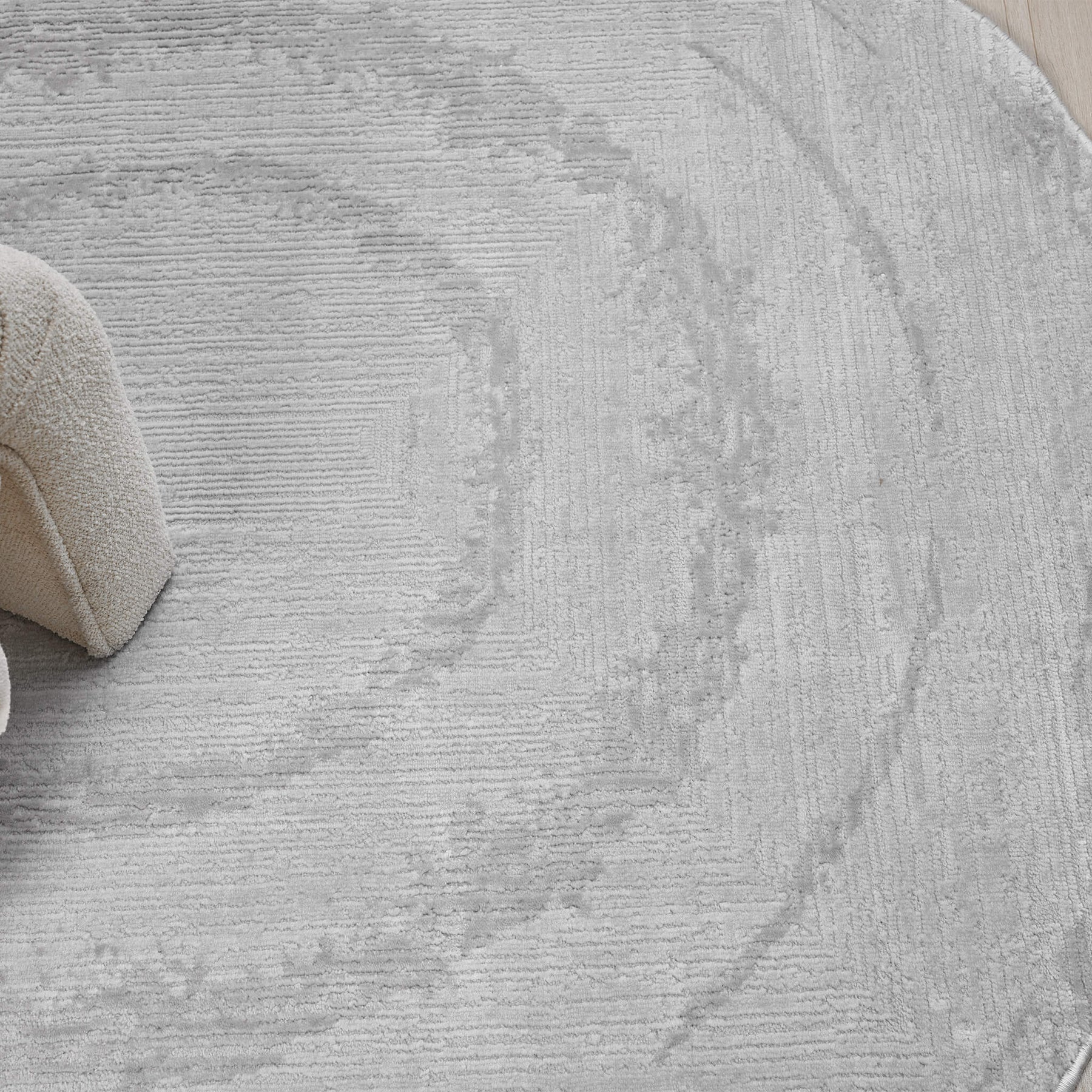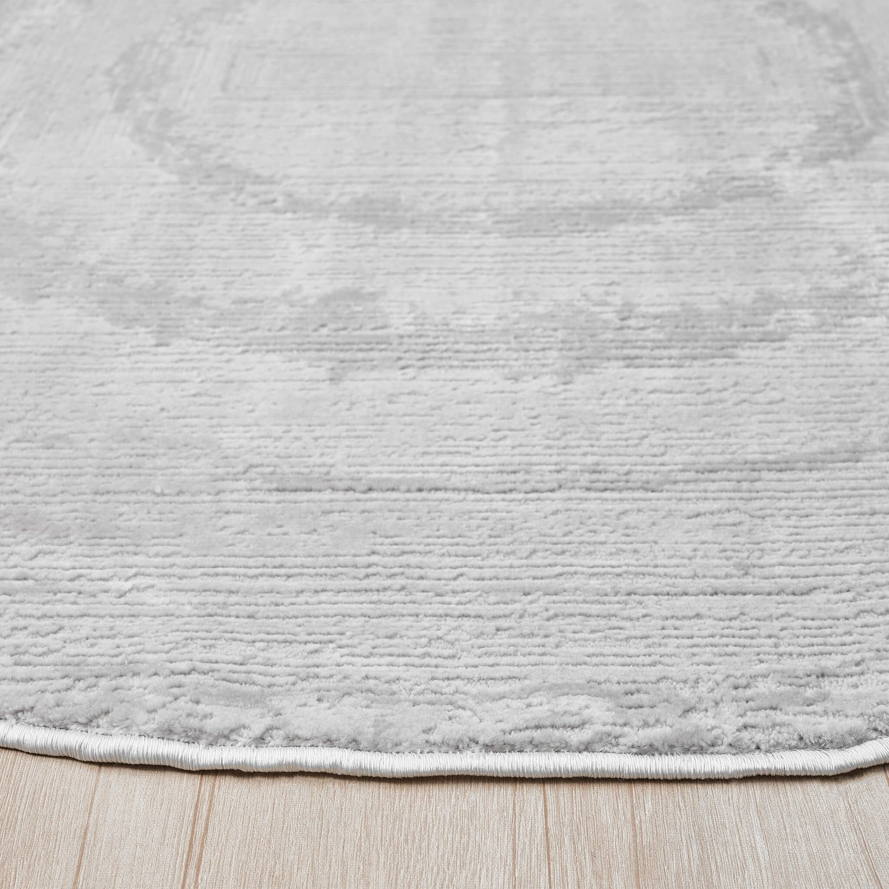 A light grey rug designed with a gentle distressed border, adding texture and softness without overwhelming your space.
